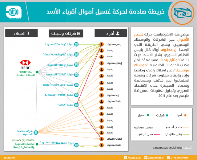 أظهرت الوثائق المسربة من شركة الخدمات القانونية موساك فونسيكا، أن الأخيرة عملت أيضاًمع رامي مخلوف، و هو ابن خال الديكتاتور “بشار الأسد”.